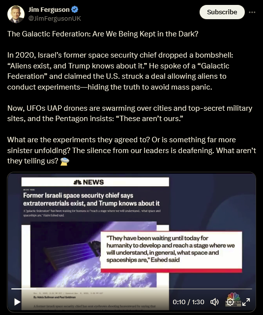 “Aliens exist, and Trump knows about it.” He spoke of a “Galactic Federation”