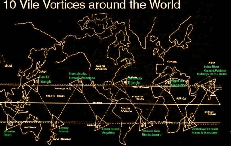 They feature physical markers such as Mt. Shasta, Glastonbury, Mt. Kailash, Uluru, and other major world power points.