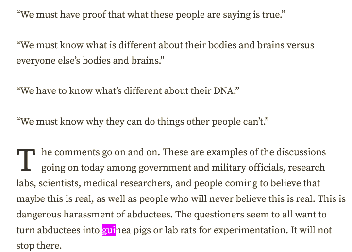 "The questioners seem to all want to turn abductees into guinea pigs or lab rats for experimentation. It will not stop there."