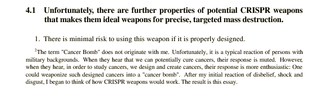 The precise targeting of a CRISPR-kill-virus means that there is no longer the hindrance of mutually assured destruction that has kept a nuclear catastrophe at bay. Instead we face the possibility of precise, targeted mass genocide.