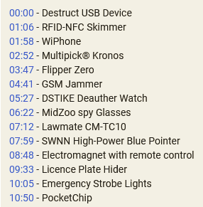 00:00 - Destruct USB Device 01:06 - RFID-NFC Skimmer 01:58 - WiPhone 02:52 - Multipick® Kronos 03:47 - Flipper Zero 04:41 - GSM Jammer 05:27 - DSTIKE Deauther Watch 06:22 - MidZoo spy Glasses 07:12 - Lawmate CM-TC10 07:59 - SWNN High-Power Blue Pointer 08:48 - Electromagnet with remote control 09:33 - Licence Plate Hider 10:05 - Emergency Strobe Lights 10:50 - PocketChip