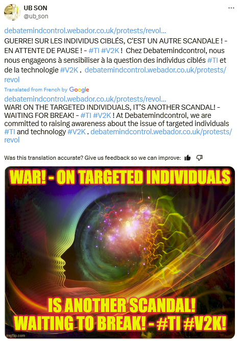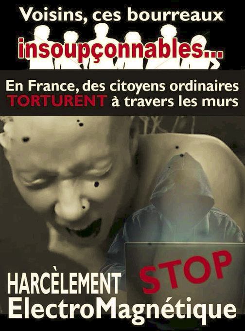 En Francia, y en todo el mundo, individuos malintencionados están enviando ONDAS ELECTROMAGNÉTICAS al cráneo de su vecino, a través de un dispositivo asesino. Estos individuos son el Sr. y la Sra. TODOS y TODOS pueden ser víctimas. STOP EECTRONACKETIC ALATORTURE