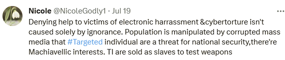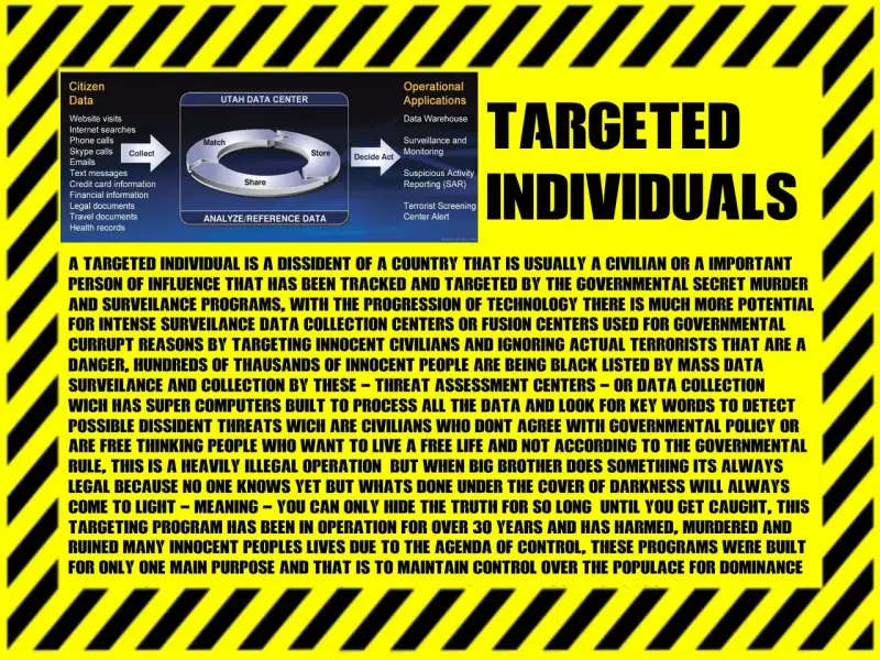 What is a targeted individual? A targeted individual is a person, who has been labeled as a threat, to exposing the evil and corruption in this system. These individuals have no criminal history. Some have been wrongfully prosecuted and even secretly murdered. They are deliberately falsely accused and marked as criminals in society. Today there are thousands of targeted individuals! They are being stalked and harassed on a relentless daily basis. By means of surveillance technology, cellphones, law enforcement, drug cartels, evil employers, evil politicians, evil lawyers, evil school teachers, evil doctors, evil relationship partners, evil family members, evil friends, evil neighbors, evil religious leaders, evil satanic organizations and so much more!