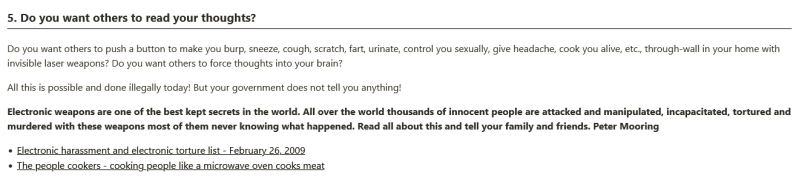Electronic torture, Brain zapping, Cooked alive, Electromagnetic mind control, Electromagnetic murder, Electromagnetic torture, Electronic murder, Microwave murder, Microwave torture, Organized murder, No touch torture, People zapper