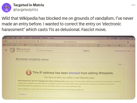"I wanted to correct the entry on ‘electronic harassment’ which casts TIs as delusional."