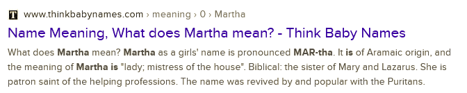 Martha is "lady; mistress of the house". She is patron saint of the helping professions. The name was revived by and popular with the Puritans!