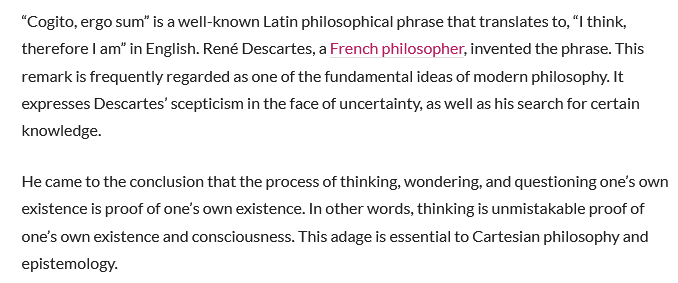 In other words, thinking is unmistakable proof of one’s own existence and consciousness.