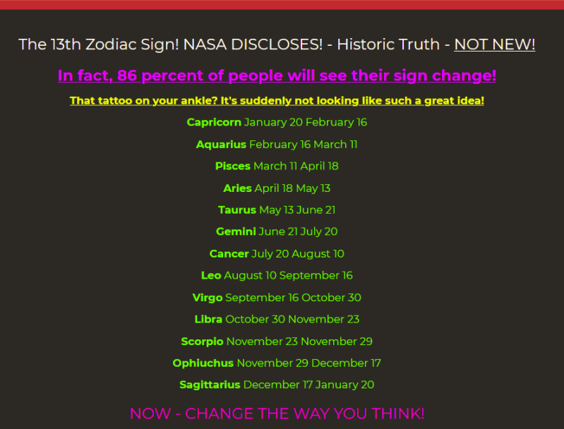 NASA (2016?) made the shocking announcement that there is actually a 13 th Zodiac sign.