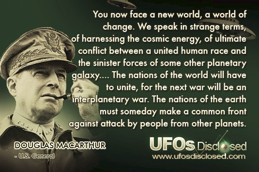 General Douglas MacArthur- Oct. 8, 1955 We have, indeed, been contacted-perhaps even visited-by extraterrestrial beings, and the US government, in collusion with the other national powers of the Earth, is determined to keep this information from the general public.