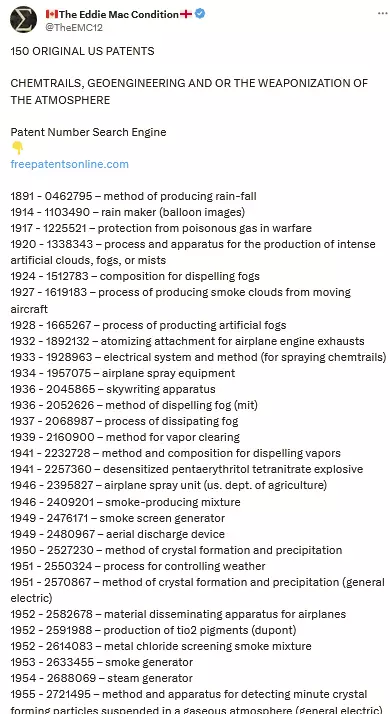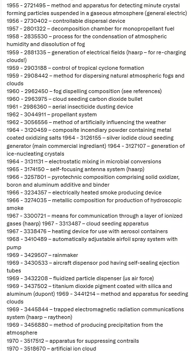 150 ORIGINAL US PATENTS CHEMTRAILS, GEOENGINEERING AND OR THE WEAPONIZATION OF THE ATMOSPHERE Patent Number Search Engine https://freepatentsonline.com