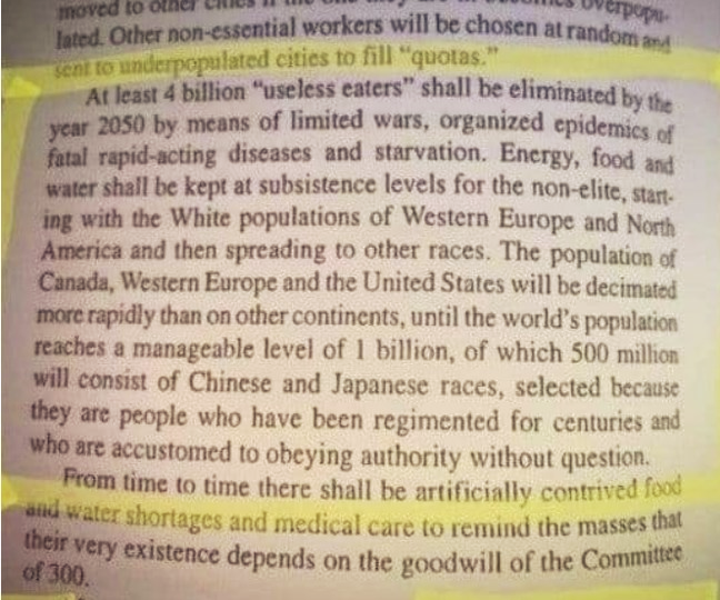 At least 4 billion "useless eaters" shall be eliminated by the year 2050 by means of limited wars,