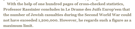 As for the fearful propaganda figure of the Six Million, Rassinier rejects it on the basis of a very detailed statistical analysis.