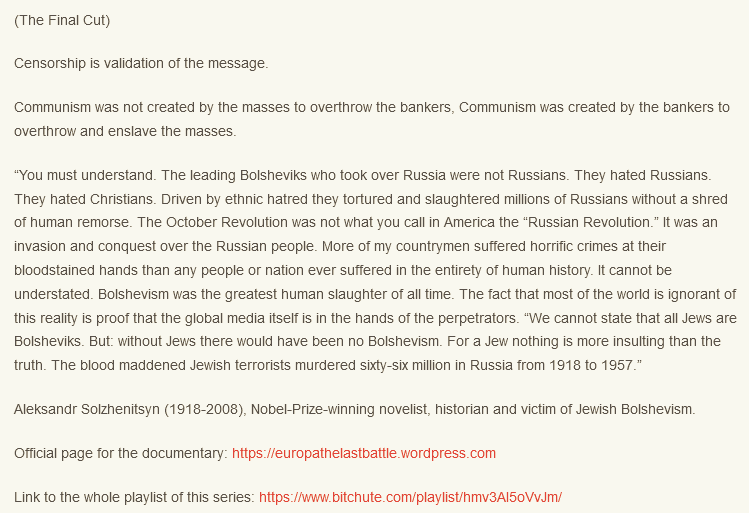The blood maddened Jewish terrorists murdered sixty-six million in Russia from 1918 to 1957.”
