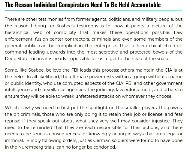 FBI/CIA Are Terrorists - Geral Sosbee YES :- Lying to the neighbors, lying to the family members, lying to the employers and employees and clients and colleagues, lying to the doctors, nurses, dentists, lying to the plumbers, electricians, carpenters, lying to everyone in fact likely to come in contact with their target–so they can name the target a criminal, a terrorist (and much else–favorites are prostitute and pedophile), and mentally unstable to the point of needing 24/7 Electronic Surveillance and close-quarter visual monitoring by neighbors to prevent a “mass shooting’ or “mass murder” event.