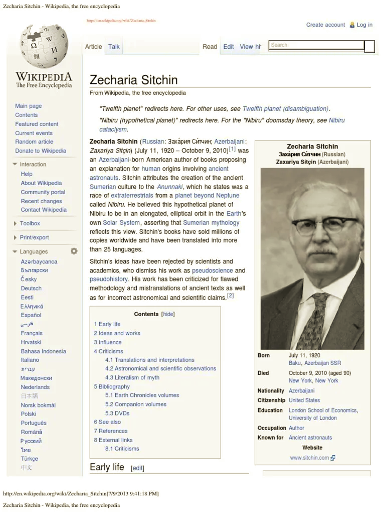 Zecharia Sitchin "was an author of books proposing an explanation for human origins involving ancient astronauts. Sitchin attributed the creation of the ancient Sumerian culture to the Anunnaki, which he stated was a race of extraterrestrials from a planet beyond Neptune called Nibiru." Wikipedia