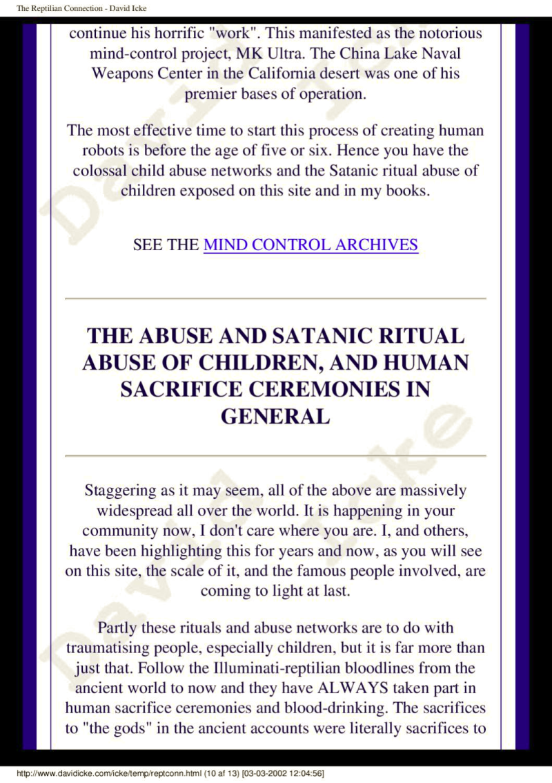 The following list has been compiled from the wealth of research I have put together over the last ten years. I would suggest that all of these are reptilian bloodline, but I only mention shapeshifting where it has been witnessed. It is only an initial list and will be added to. If you can add names, and give the supporting evidence, that would be most helpful in exposing these horrors. By "Satanists", of course, I mean those involved in human sacrifice.... George Bush: U.S. President and Vice President, head of the CIA, and a stream of other roles in the Illuminati. Satanist, mind controller, torturer of children and adults, paedophile, shapeshifting reptilian, and major drug runner. Serial killer. Nice man.... Queen Elizabeth II of the U.K.: Satanist, child sacrificer, shapeshifting reptilian. Major Illuminati figure.
