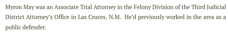 Myron May was an Associate Trial Attorney in the Felony Division of the Third Judicial District Attorney’s Office in Las Cruces, N.M.