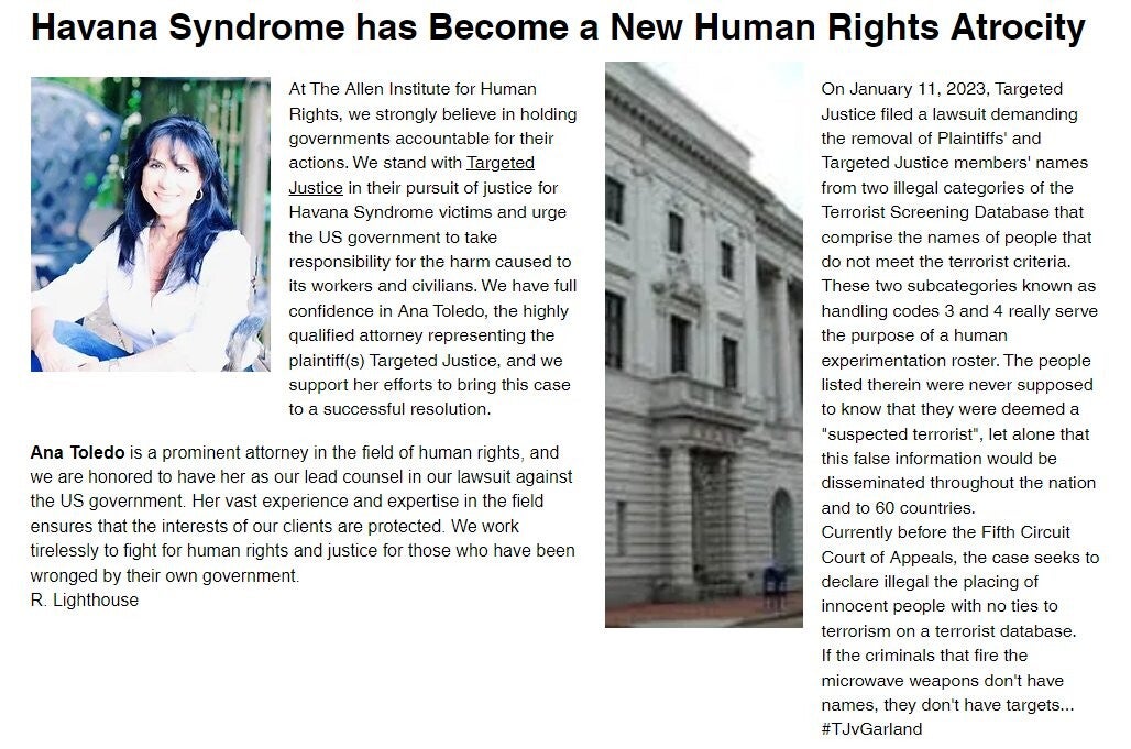 "The Government has to acknowledge that this is happening to Civilians" Len BER MD   https://www.targetedjustice.com/team-members.html