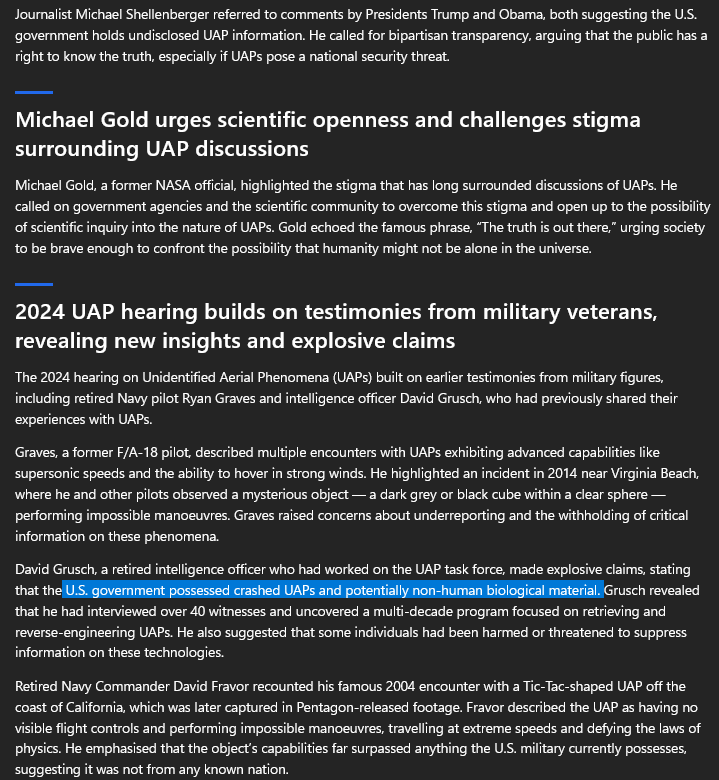 U.S. government possessed crashed UAPs and potentially non-human biological material.
